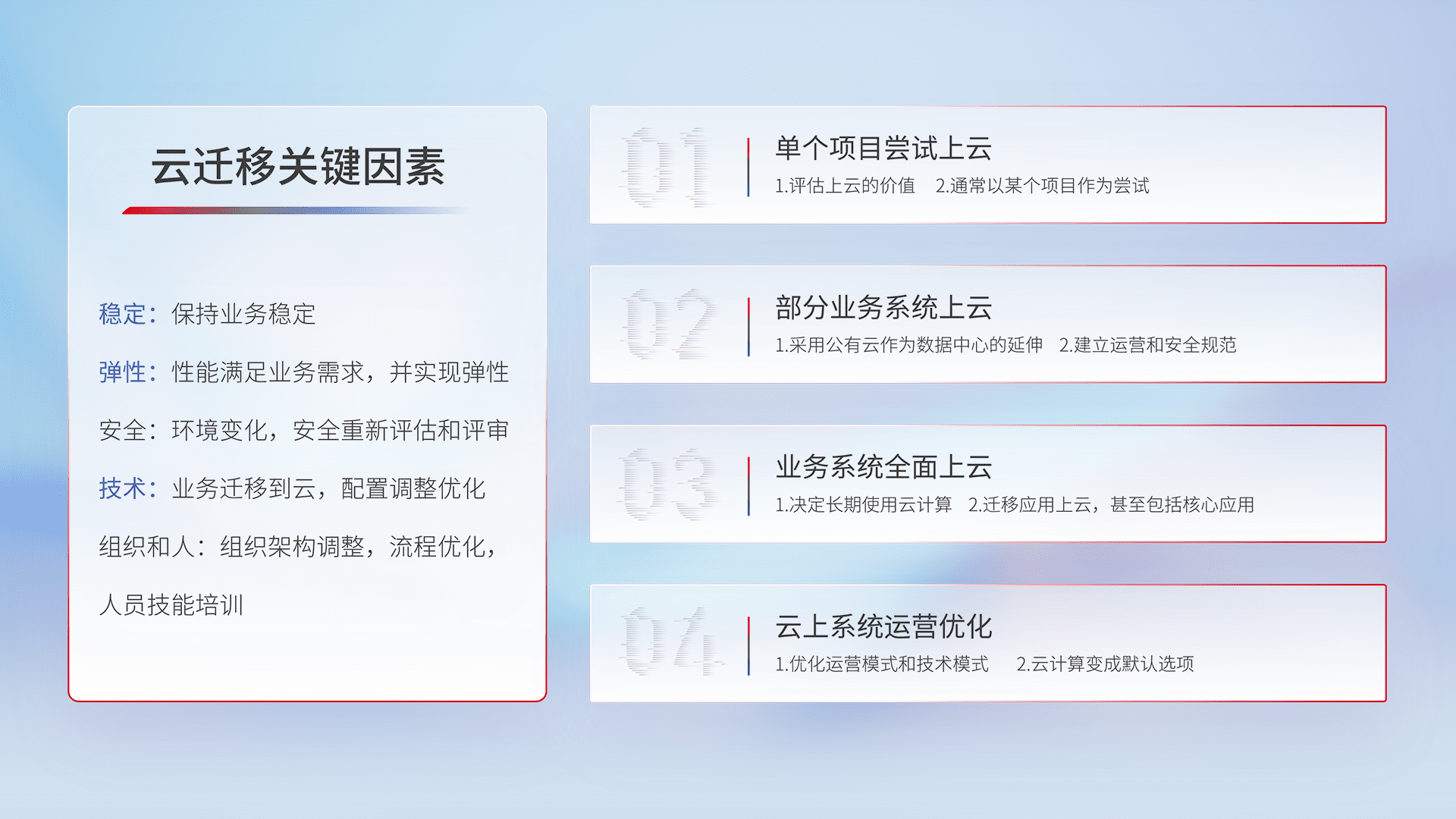 结合实际业务,,从规划设计、、云平台选型、、、云原生改造、、、、数据迁移、、、集成交付,,,,迁移全过程为客户识别最佳上云路径,,,做好风险识别管理,,,设计网络架构、、、、身份权限、、安全审计合规、、、、操作审计、、日志审计、、、、监控告警策略、、、、多站点容灾设计等,,对云上基础设施进行整体规划,,,提升IT治理水平,,,以满足弹性、、高可用、、高性能的需求。。