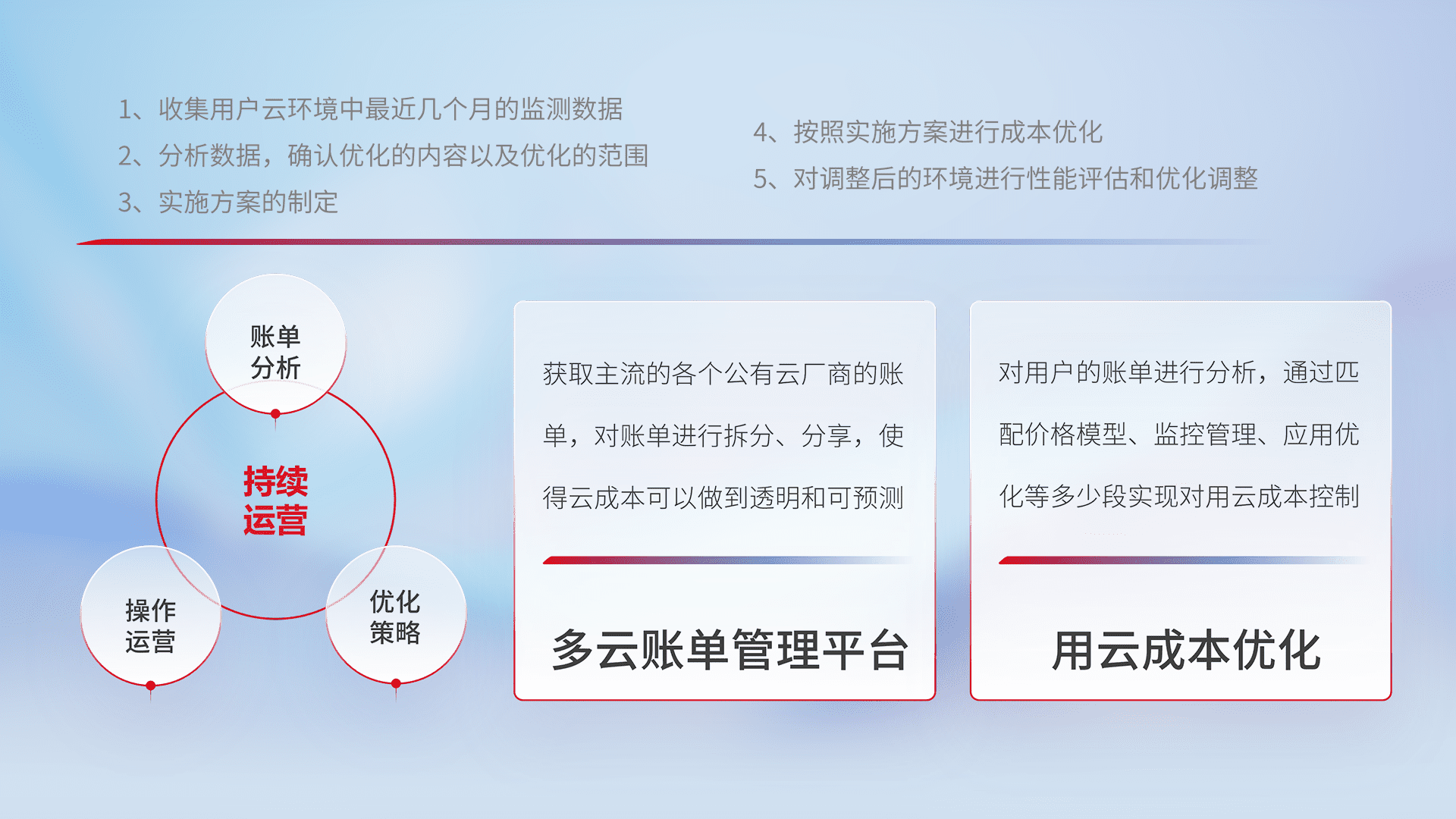 通过多云纳管,,以统一的资源数据模型把客户的云资源进行抽象和封装,,进而实现对多云资源的统一操作,,保障云资源管理的可靠性、、、稳定性与可用性。。量身定制化运维内容,,,,配置、、、、开发运维、、、、补丁管理、、、、备份、、、、监控、、、认证和访问管理、、审计和日常巡检等,,保障在用云过程中的可靠度,,稳定度以及高可用率。。。